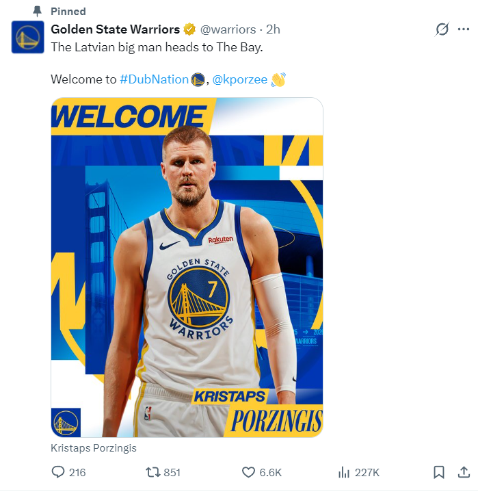 勇士官方宣布交易达成欢迎波尔津吉斯到来。